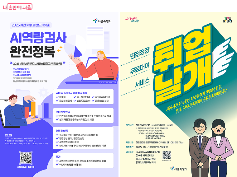 서울시의 취업 지원 프로그램은 그야말로 ‘올인원 서비스’입니다. AI 면접부터 정장 대여, 특강, 인턴십까지 한 번에 해결할 수 있는 기회는 흔치 않죠. 지금 바로 서울일자리포털이나 AI역량검사 누리집에 접속해 예약해보세요. 여러분의 첫 출근을 서울시가 함께 준비해드립니다.