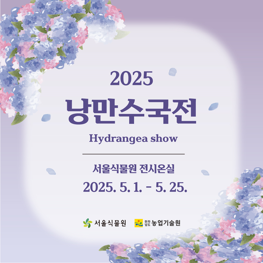 - 전시 품종: 전남농업기술원에서 개발·재배한 국내 수국 품종으로, 핑크아리, 그린아리, 화이트아리, 모닝스타, 핑크유, 썸머스타 등 다양한 색상과 형태의 수국을 감상하실 수 있습니다.